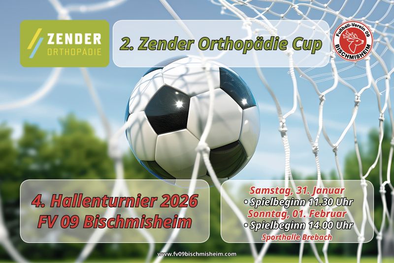 am 31. Januar und 1. Februar veranstalten wir unser 4. Hallenturnier für aktive Mannschaften, den 2. ZENDER ORTHOPÄDIE CUP. An zwei Tagen werden 17 Mannschaften um den Turniersieg spielen. Besonders freuen wir uns darauf, dass unsere jüngsten Kicker den sportlichen Rahmen mit zwei Einlagenspielen der G- und F-Jugend bereichern werden.